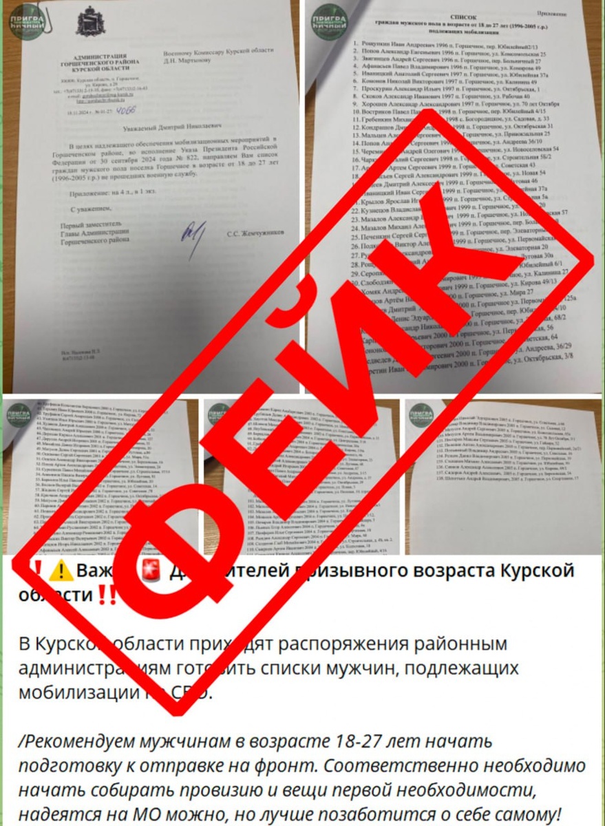 «Рекомендуем мужчинам в возрасте 18-27 лет начать подготовку к отправке на фронт», - говорится в послании, распространяемом в соцсетях. Отмечается, что районным администрациям якобы приходят распоряжения готовить списки мужчин, подлежащих мобилизации на СВО. В Правительстве Курской области данную информацию опровергли. Изначально подобные публикации стали появляться в украинских каналах, затем ЦИПсО растиражировали фейк в комментариях региональных и местных групп. Подготовка мобилизационных списков жителей не ведётся, - заверили в региональном Правительстве.