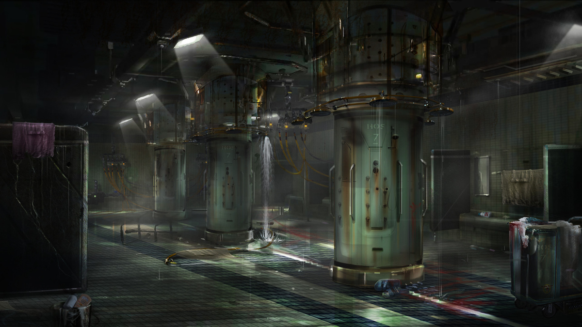 Душевая комната была покрыта странной бесцветной слизью. На стенах находились кровяные наросты, а с потолка свисали не то "яйца", не то какая-то дрянь. С некоторых леек по прежнему бежала вода, где-то лежали скелеты, некоторые были прикрыты полотенцами по пояс. А по середине стоял он...