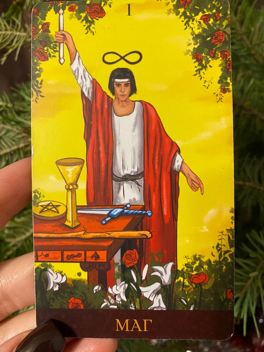 Карта Маг с нумерологией единицы, идет сразу же после шута (нулевой аркан). Обратите внимание, что на карте все четыре масти: жезл в руке, кубок на столе и там же меч и пентакль. Что и будет означать "ВСЕ в твоих руках".