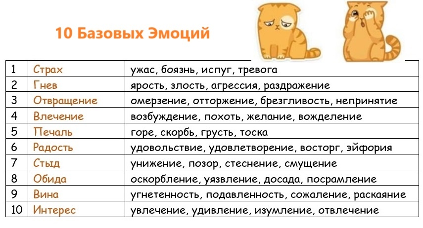 Важно научиться распознавать, осознавать и называть свои и чужие эмоции. Давайте для начала посмотрим, какие у нас есть базовые эмоции: