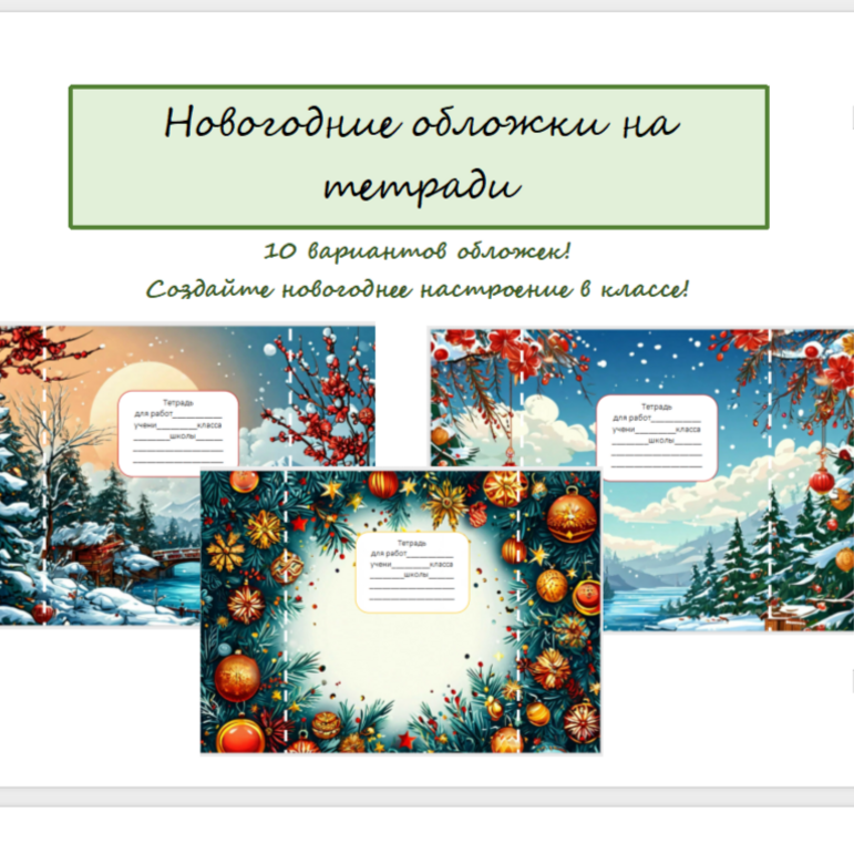 В данной методической разработке представлено 10 вариаций обложек на тетради. Создайте новогоднее настроение в классе!