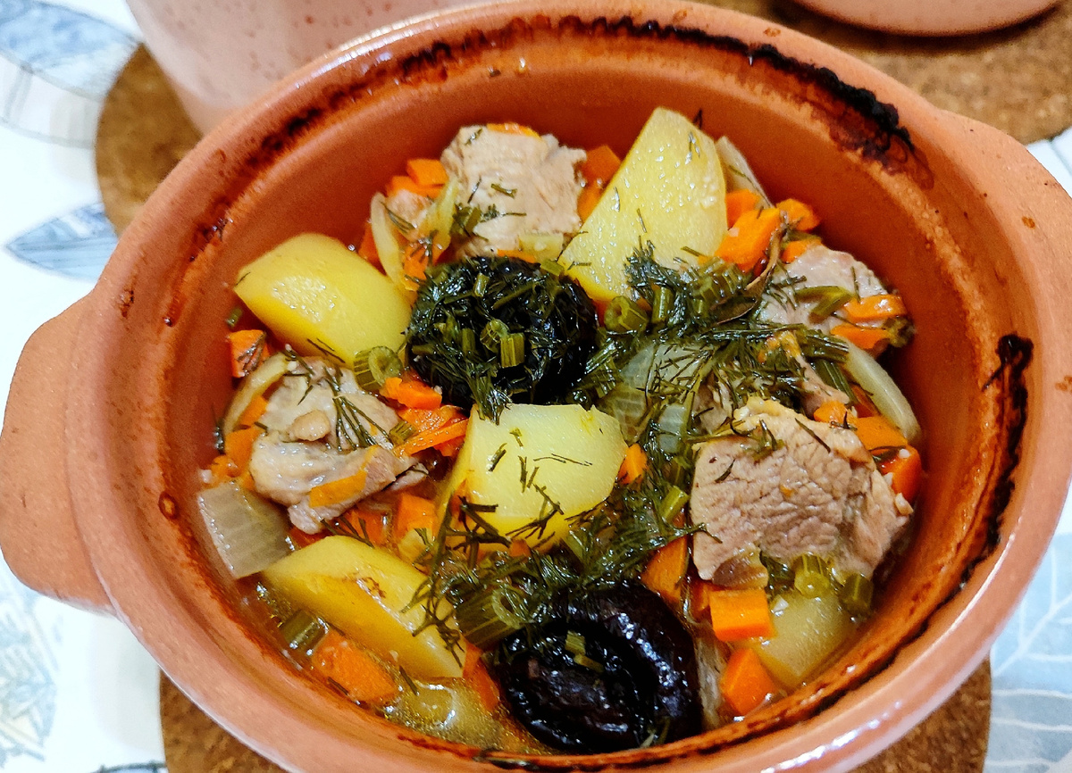 Рада приветствовать Вас на моём канале! Вариаций такого блюда большое количество, можно добавить: 1) Крупно нарезанный лук и морковь, нарезанную мелким кубиком (или произвольно) слегка обжарить на огне чуть выше среднего. Вынуть. 2) На этой же сковороде обжарить крупно порезанный картофель до румяности на большом огне. Периодически помешивая. Вынуть. Лук, морковь и картофель жарю на сливочном масле, т.к. при этом происходит карамелизация молочных остатков и вкус становится ярче. 3) Теперь на этой же сковороде обжарить крупно порезанное мясо до лёгкой корочки на максимальном огне. Добавить 1 ч.л. сухого чеснока. 4) Чернослив залить кипятком на 2 минуты. 1 слой - мясо; 2 слой - картошка; 3 слой - лук с морковью; 4 слой - чернослив (2 шт. в каждый горшочек); 5 слой - в каждый горшочек добавить по 2 шт. перца горошком, по половинке лаврового листа, посолить по вкусу; 6 слой - остатки мяса, картошки; 7 слой - зелень (можно добавить сразу, а можно добавить перед подачей). Жаркое готов