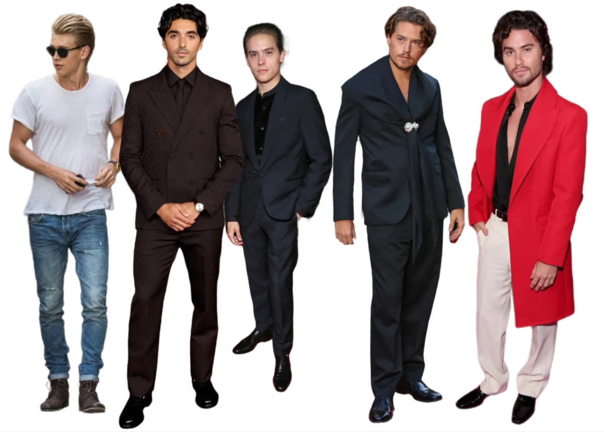 1991-го года рождения Остин Батлер и Тейлор Захар Перес, 1992-го братья-близняшки Дилан (мелкий) и Коул (стильняшка) Спраусы, а красавчик в красном лапсердаке - Чейз Стоукс, тоже с 1992 г.р.: