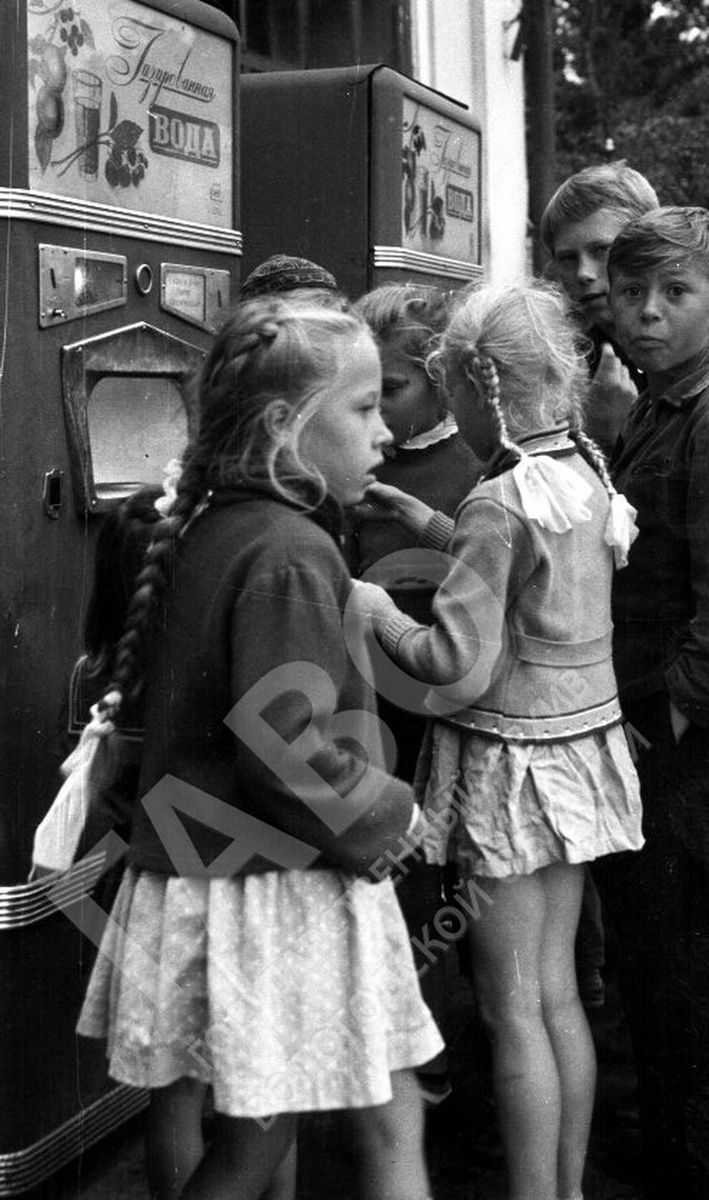 Замечательный снимок 1960 года из фондов Государственного архива Вологодской области. Дети осадили автоматы с газировкой на площади Революции по соседству с Детским парком. А стояли автоматы у стены кинотеатра имени Горького. На втором снимке помечено место, где они находились.