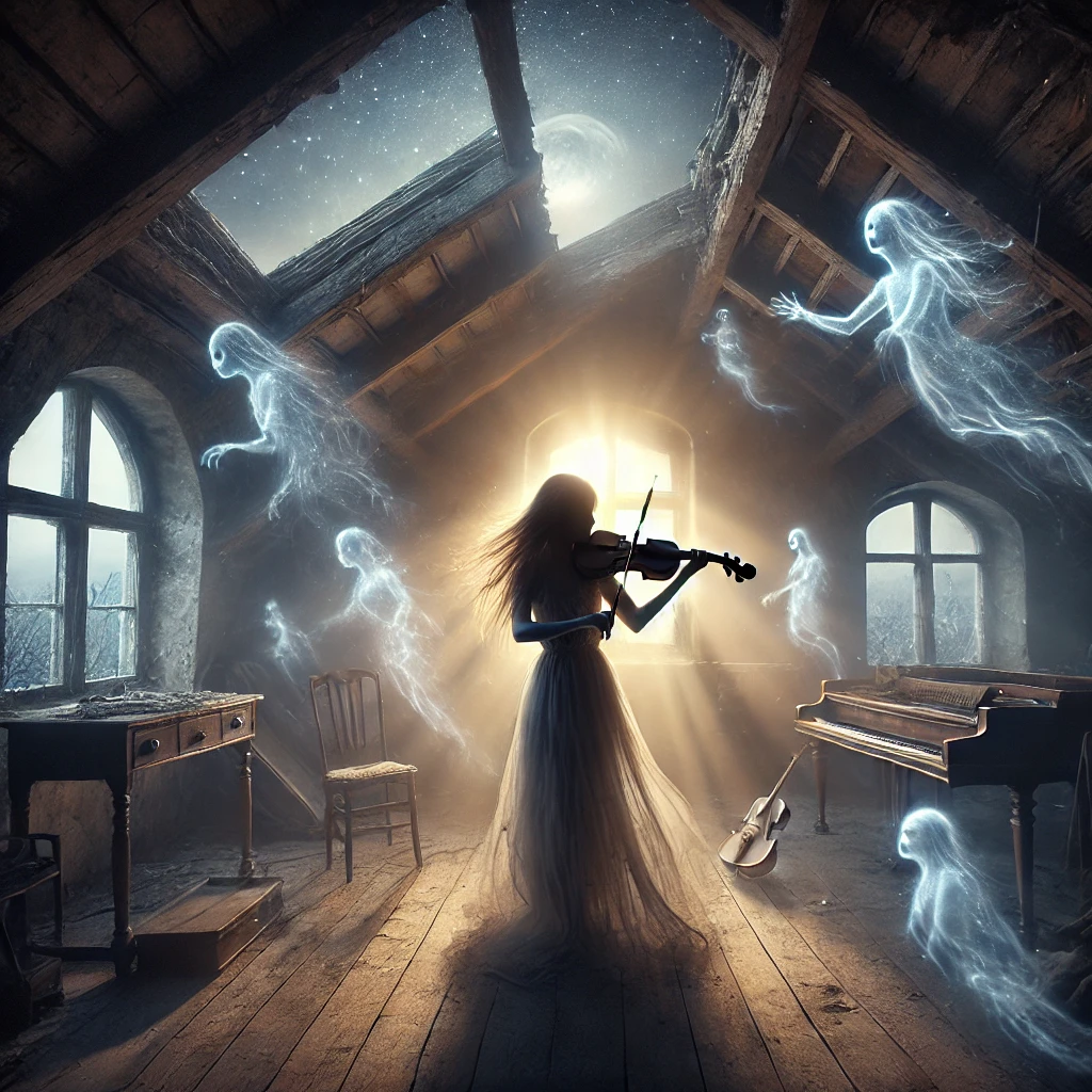 На чердаке старого дома она нашла скрипку. Гладкое дерево потемнело от времени, а струны оборвались и исчезли много лет назад. Она взяла инструмент, как будто он был живым существом, и провела пальцами по пустому грифу. Внизу, в доме, где больше никто не жил, заскрипел пол. Она обернулась. Пустота. Но что-то настойчиво тянуло её назад. — Играй, — раздался чей-то шепот. Девушка подняла скрипку, прижала к плечу, словно в шутку, и повела смычком. И вдруг раздалось нечто: не звук, а стон, который обжёг воздух. Ветер закружился вокруг, не давая ей опустить инструмент. Стон сменился мелодией, нежной и жуткой одновременно, пока комната не заполнилась тенями. — Играй дальше, — шепнули чьи-то голоса, комнату стали наполнять бледные силуэты людей, будто сотканные из пыли и лунного света. — Ты пробудила нас. Она пыталась остановиться, но её руки больше не подчинялись. Скрипка пела, а дом оживал, его стены становились прочнее, мебель — новой, окна — светлыми. Когда мелодия оборвалась, деву