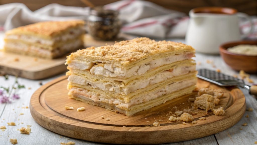 - Соберите торт: На плоское блюдо положите первый слой теста, затем распределите часть куриной начинку. Продолжайте укладывать слои до завершения всех ингредиентов.