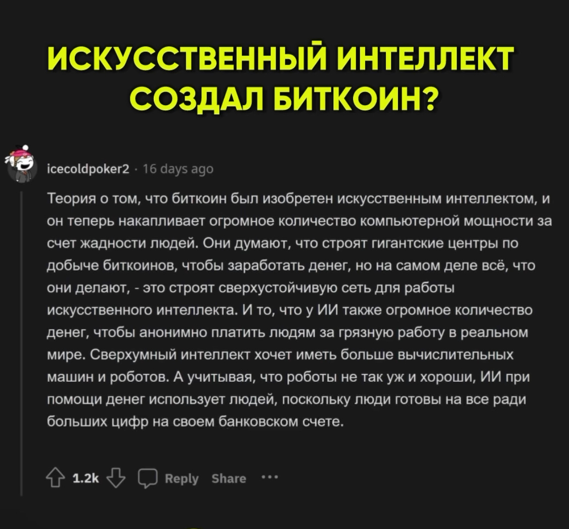 Искусственный интеллект и создание Bitcoin : миф или реальность? С момента появления биткоина в 2009 году личность или группа лиц, скрывающаяся под псевдонимом Сатоши Накамото, остаётся одной из самых больших загадок в мире технологий. Эта анонимность породила множество теорий о том, кто или что стоит за созданием первой криптовалюты. Одной из таких гипотез является предположение, что биткоин мог быть создан искусственным интеллектом (ИИ). Давайте разберёмся, насколько правдоподобна эта версия. Биткоин: основа технологии Биткоин — это первая в мире криптовалюта, основанная на технологии блокчейн. Она представляет собой децентрализованную систему, которая позволяет пользователям совершать транзакции без участия банков и других посредников. Основные компоненты биткоина: 1. Блокчейн — цепочка блоков с информацией о транзакциях. 2. Криптографические алгоритмы — обеспечивают безопасность и неизменность данных. 3. Доказательство работы (Proof-of-Work) — метод подтверждения транзакций и