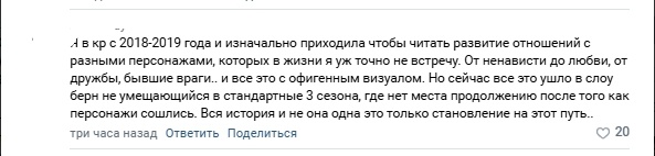 Фандом массово жалуется на то, что в большинстве онгоингов отношения со всеми фаворитами развиваются очень медленно. Поцеловались во втором сезоне, занялись сексом раза 2 в истории да и то, в финальном сезоне...