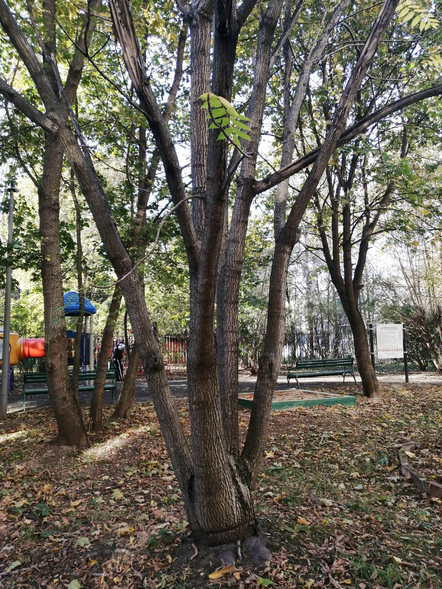 С деревом (породой) всё просто. Даже элементарно! Просто листья в кадр на первых, "свежих" фото, не попали. б Хотя вот, вижу, и вы тоже наверняка можете догадаться: А вот что с ним случилось, почему так, сложнее догадаться. Но история поучительная! Это след от... шины. Я, может, и не догадалась бы. Но знаю, т.к. видела, что шина там была несколько лет назад. Более того, я даже фото сделала. Так что доказательства есть! Фото, что было "до", сентябрь 202О года: Двор тот же, бордюр тот же! Даже детский игровой комплекс пока не поменяли, что странно, с тягой всё благоустроить, потом переблагоустроить, и почти сразу всё снести и по новой. Дерево то же, хотя чуть стройнее, ведь было 4 года назад! И крона ниже, листья на фото из этой серии видны чётче: Шина тогда врезалась в кору дерева (деревьев) и уже была деформировала, притом сильно! Теперь, без шины, дерево может спокойно "дышать", может украшать и притенять этот обычный московский дворик неподалёку от моей школы дальше. Видимо, шино