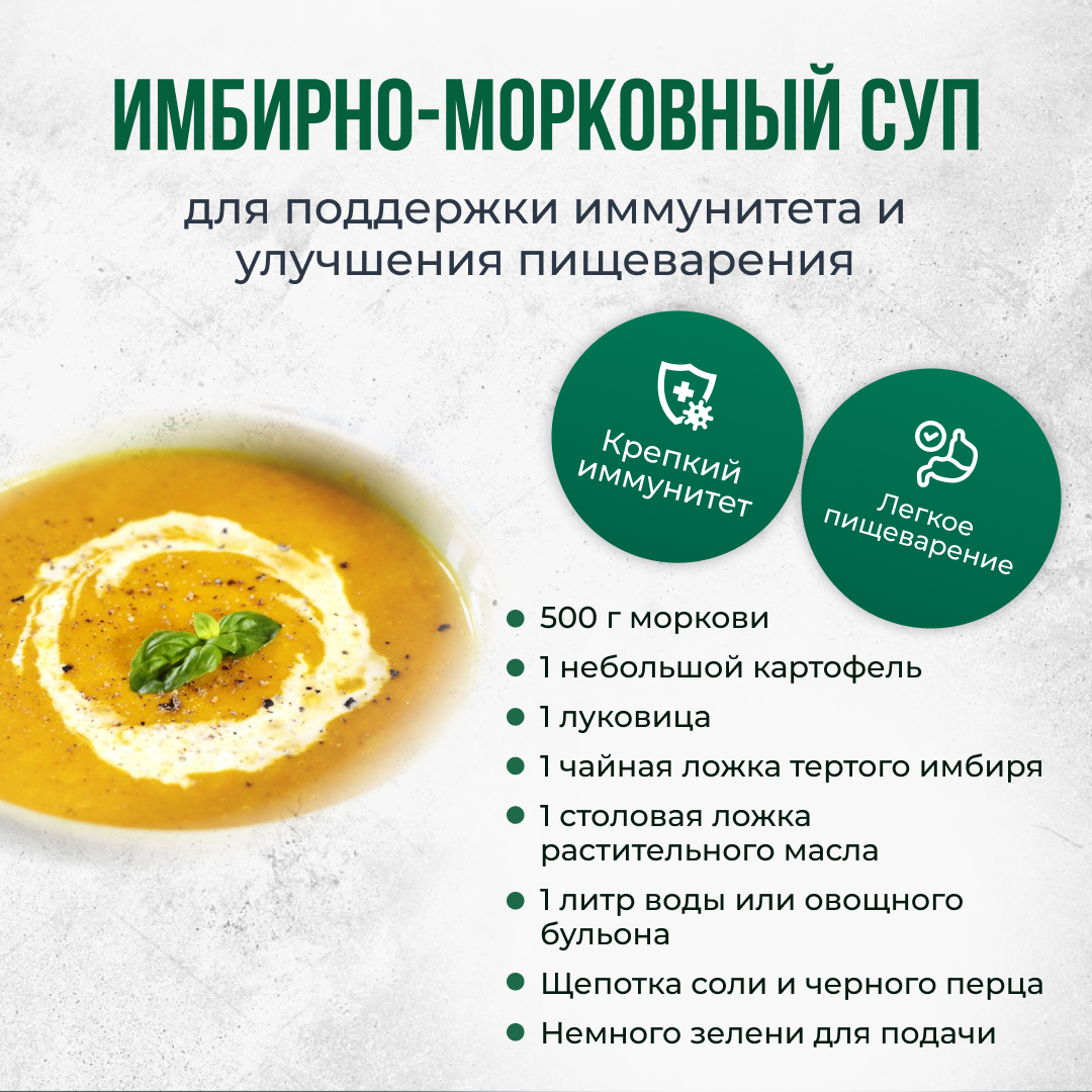 ΠΡΠΎΡ ΡΡΠΏ Ρ ΠΈΠΌΠ±ΠΈΡΠ΅ΠΌ ΠΈ ΠΌΠΎΡΠΊΠΎΠ²ΡΡ β Π»Π΅Π³ΠΊΠΎΠ΅, ΡΠΎΠ³ΡΠ΅Π²Π°ΡΡΠ΅Π΅ Π±Π»ΡΠ΄ΠΎ, ΠΊΠΎΡΠΎΡΠΎΠ΅ ΠΌΠΎΠΆΠ΅Ρ ΠΏΠΎΠΌΠΎΡΡ ΡΠΏΡΠ°Π²ΠΈΡΡΡΡ Ρ ΠΏΡΠΎΡΡΡΠ΄ΠΎΠΉ ΠΈ ΠΏΠΎΠ΄Π΄Π΅ΡΠΆΠ°ΡΡ Π·Π΄ΠΎΡΠΎΠ²ΡΠ΅ ΠΆΠ΅Π»ΡΠ΄ΠΊΠ°. ΠΠ½Π³ΡΠ΅Π΄ΠΈΠ΅Π½ΡΡ: 500 Π³ ΠΌΠΎΡΠΊΠΎΠ²ΠΈ 1 Π½Π΅Π±ΠΎΠ»ΡΡΠΎΠΉ ΠΊΠ°ΡΡΠΎΡΠ΅Π»Ρ 1 Π»ΡΠΊΠΎΠ²ΠΈΡΠ° 1 ΡΠ°ΠΉΠ½Π°Ρ Π»ΠΎΠΆΠΊΠ° ΡΠ΅ΡΡΠΎΠ³ΠΎ ΠΈΠΌΠ±ΠΈΡΡ 1 ΡΡΠΎΠ»ΠΎΠ²Π°Ρ Π»ΠΎΠΆΠΊΠ° ΡΠ°ΡΡΠΈΡΠ΅Π»ΡΠ½ΠΎΠ³ΠΎ ΠΌΠ°ΡΠ»Π° 1 Π»ΠΈΡΡ Π²ΠΎΠ΄Ρ ΠΈΠ»ΠΈ ΠΎΠ²ΠΎΡΠ½ΠΎΠ³ΠΎ Π±ΡΠ»ΡΠΎΠ½Π° Π©Π΅ΠΏΠΎΡΠΊΠ° ΡΠΎΠ»ΠΈ ΠΈ ΡΠ΅ΡΠ½ΠΎΠ³ΠΎ ΠΏΠ΅ΡΡΠ° ΠΠ΅ΠΌΠ½ΠΎΠ³ΠΎ Π·Π΅Π»Π΅Π½ΠΈ Π΄Π»Ρ ΠΏΠΎΠ΄Π°ΡΠΈ ΠΡΠΎΡΡΡΠ΅ ΡΠ°Π³ΠΈ ΠΏΡΠΈΠ³ΠΎΡΠΎΠ²Π»Π΅Π½ΠΈΡ: ΠΠ°ΡΠ΅ΠΆΡΡΠ΅ ΠΌΠΎΡΠΊΠΎΠ²Ρ, ΠΊΠ°ΡΡΠΎΡΠ΅Π»Ρ ΠΈ Π»ΡΠΊ ΠΊΡΡΠΏΠ½ΡΠΌΠΈ ΠΊΡΡΠΎΡΠΊΠ°ΠΌΠΈ. Π ΠΊΠ°ΡΡΡΡΠ»Π΅ ΡΠ°Π·ΠΎΠ³ΡΠ΅ΠΉΡΠ΅ ΠΌΠ°ΡΠ»ΠΎ ΠΈ ΠΎΠ±ΠΆΠ°ΡΡΡΠ΅ Π»ΡΠΊ Π΄ΠΎ ΠΏΡΠΎΠ·ΡΠ°ΡΠ½ΠΎΡΡΠΈ. ΠΠΎΠ±Π°Π²ΡΡΠ΅ ΠΌΠΎΡΠΊΠΎΠ²Ρ, ΠΊΠ°ΡΡΠΎΡΠ΅Π»Ρ ΠΈ ΠΈΠΌΠ±ΠΈΡΡ, ΠΏΠ΅ΡΠ΅ΠΌΠ΅ΡΠ°ΠΉΡΠ΅ ΠΈ Π³ΠΎΡΠΎΠ²ΡΡΠ΅ 2β3 ΠΌΠΈΠ½ΡΡΡ. ΠΠ°Π»Π΅ΠΉΡΠ΅ ΠΎΠ²ΠΎΡΠΈ Π²ΠΎΠ΄ΠΎΠΉ ΠΈΠ»ΠΈ Π±ΡΠ»ΡΠΎΠ½ΠΎΠΌ, Π΄ΠΎΠ²Π΅Π΄ΠΈΡΠ΅ Π΄ΠΎ ΠΊΠΈΠΏΠ΅Π½ΠΈΡ ΠΈ Π²Π°ΡΠΈΡΠ΅ Π½Π° ΡΡΠ΅Π΄Π½Π΅ΠΌ ΠΎΠ³Π½Π΅ 20β25 ΠΌΠΈΠ½ΡΡ Π΄ΠΎ ΠΌΡΠ³ΠΊΠΎΡΡΠΈ. Π‘ ΠΏΠΎΠΌΠΎΡΡΡ Π±Π»Π΅Π½Π΄Π΅ΡΠ° ΠΏΡΠ΅Π²ΡΠ°ΡΠΈΡΠ΅ ΡΡΠΏ Π² ΠΏΡΡΠ΅, Π΄ΠΎΠ±Π°Π²ΡΡΠ΅ ΡΠΎΠ»Ρ ΠΈ ΠΏΠ΅ΡΠ΅Ρ ΠΏΠΎ Π²ΠΊΡΡΡ. ΠΠΎΠ΄Π°Π²Π°ΠΉΡΠ΅, ΠΏΠΎΡΡΠΏΠ°Π² ΡΠ²Π΅ΠΆΠ΅ΠΉ Π·Π΅Π»Π΅Π½ΡΡ. ΠΡΠΎΡ ΡΡΠΏ ΡΠΎΠ³ΡΠ΅Π΅Ρ, Π½Π°ΡΡΡΠΈΡ Π²ΠΈΡΠ°ΠΌΠΈΠ½Π°ΠΌΠΈ ΠΈ ΠΏΠΎΠ΄Π°ΡΠΈΡ ΠΊΠΎΠΌΡΠΎΡΡΠ½ΠΎΠ΅ ΠΎΡΡΡΠ΅Π½ΠΈΠ΅ Π»Π΅Π³ΠΊΠΎΡΡΠΈ. ΠΡΠΈΡΡΠ½ΠΎΠ³ΠΎ Π°ΠΏΠΏΠ΅ΡΠΈΡΠ° ΠΈ Π·Π΄ΠΎΡΠΎΠ²ΡΡ Π² Π½ΠΎΠ²ΠΎΠΌ Π³ΠΎΠ΄Ρ! ππ²