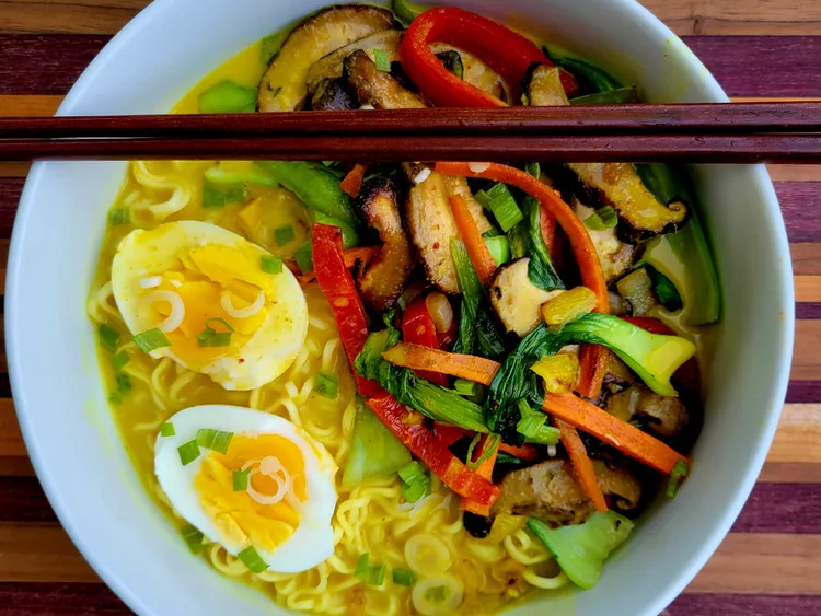 Coconut Curry Ramen — это блюдо, которое удивит и порадует каждого. Сочетание насыщенного карри, кремового кокосового молока, ароматных овощей и идеально сваренного яйца делает этот рамен неповторимым. Несмотря на свою быстроту в приготовлении, это блюдо выглядит и вкусает как настоящее кулинарное произведение, достойное ресторана. Рамен — традиционное японское блюдо, которое приобрело мировую популярность благодаря своему универсальному вкусу и способности адаптироваться к различным кухонным традициям. Coconut Curry Ramen представляет собой западный взгляд на классический азиатский рамен, в который добавлены элементы индийской кухни, такие как карри и кокосовое молоко. Это блюдо идеально сочетает ароматы Востока и Запада, создавая уникальное ощущение тепла и уюта. Вскипятите 1,2 литра воды в кастрюле. Добавьте лапшу и варите около 4 минут (или по инструкции на упаковке), пока она не станет мягкой, но сохранит легкую упругость. Слейте воду и отложите лапшу в сторону. Нагрейте 1 ст. лож