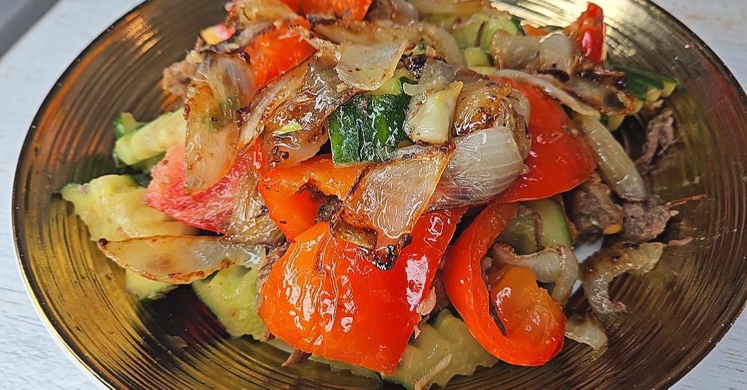Рецепт : Говядину отварить 500гр, затем пожарить сливочном масле, Лук репчатый нарезать как вам нравиться пожарить сливочном масле и добавить 1 ч .л сахара Перец сладкий нарезать как пожелаете и пожарить сливочном масле, добавить 1ч .л сахара Помидоры 2шт Огурцы 2шт Для соуса : Бальзамически соус 60гр Чеснок 4 зубчика Оливковое масло 20гр Лимонный сок 2ст.л Соль 1ч.л Соединить все ингридиенты Заправить соусом салат Попробуйте приготовить , очень вкусно