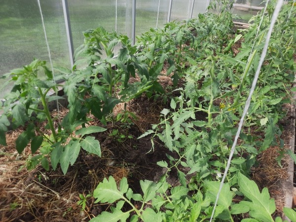 Я всегда шучу, что мои томаты, растущие в два ряда - это монстры. Особенно в июле, когда они достигают максимальной вегетативной массы, а листья и верхушки еще не убираются, напряжение достигает пика. Пробираешься между рядами, а они цепляются, не дают пройти. Намекают: "Подвяжи, обрежь, направь на путь истинный". И это при том, что все томаты у меня строго сформированы в два стебля, часто пасынкуются и вообще не балуют.