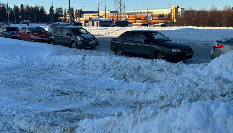 Снег блокирует въезд на парковку у медучреждения в Петрозаводске