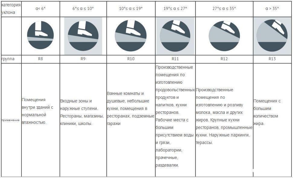 Среднестатистический человек выбирает плитку исключительно по внешнему виду, на глаз. Однако, чтобы выбранная плитка для пола вас не разочаровала в процессе укладки и эксплуатации, стоит знать несколько параметров, по которым выбирается напольная плитка. Этот показатель определяет степень сцепления плитки с обувью, особенно важен он там, где высока вероятность появления воды на поверхности плитки. Обозначается он буквой R и цифрами: R9-R13. Измеряется с помощью специальных тестов, включая наклонные испытания или проверки по шкале DIN 51130. Для напольной плитки это очень важный показатель, поскольку от степени ее скольжения зависит ваша безопасность. Нужно понимать, что плитка в принципе будет скользким материалом, если сравнивать ее с пробкой или ковролином. Для облицовки уличных ступеней, крыльца или веранды рекомендуется плитка не меньше R12. Для помещений выбор осложняется тем, что плитка с коэффициентами R11- R12 обычно не отличается высокой декоративностью, к которой все стремят