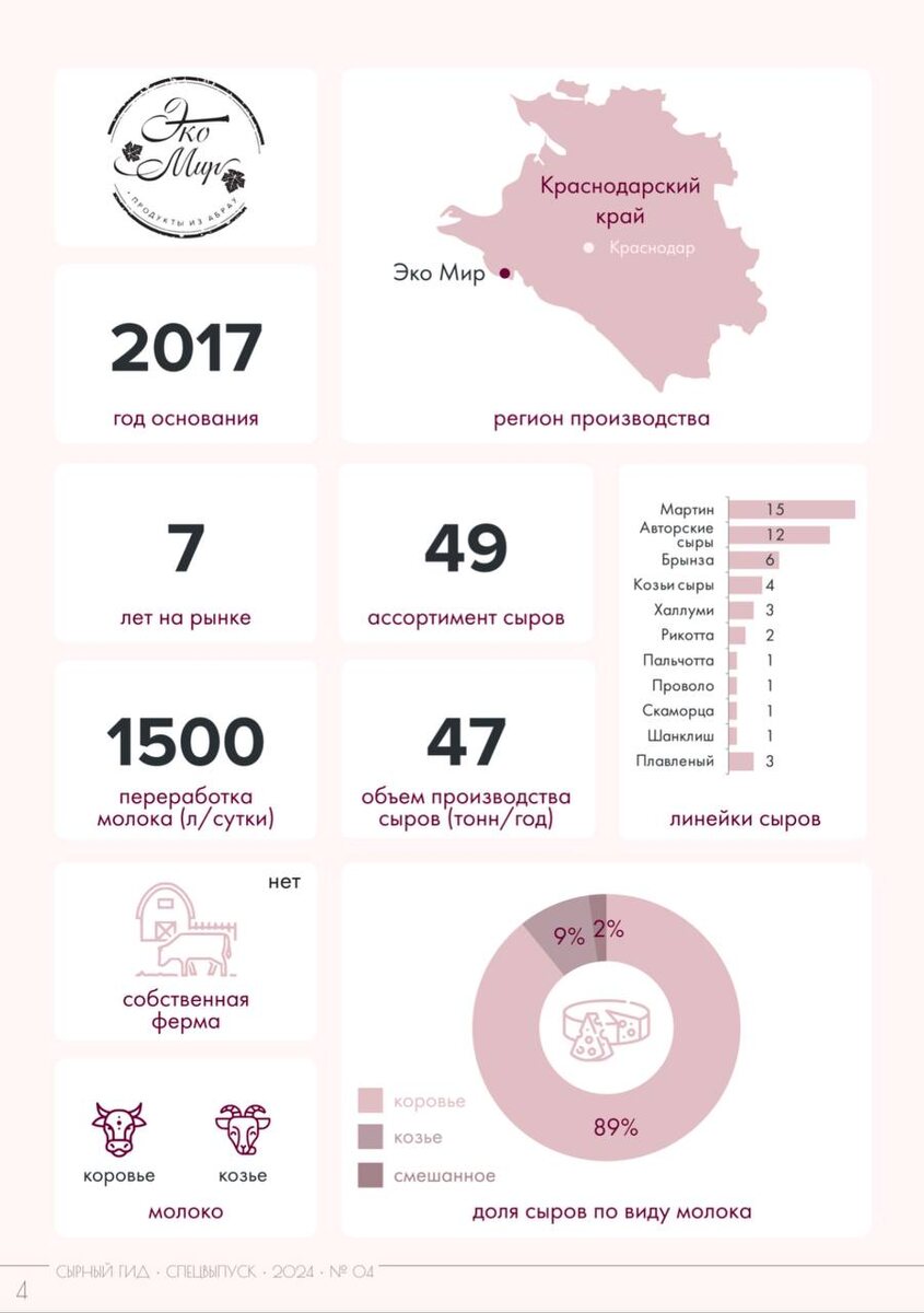 Спецвыпуск журнала "Сырный гид" мы посвятили анализу сыров от компании "Эко Мир", расположенной в Краснодарском крае, с. Абрау-Дюрсо. Спешим поделиться своими выводами с вами. Сыр с хорошим балансом во вкусе, при яркой молочнокислой ноте она не выпирает, хорошо вписывается в баланс вкуса. Ароматический и вкусовой профили дружелюбные, послевкусие с молочной, фруктовой нотами и остринкой. Сыр идеален для холодных и горячих блюд, брускетт и сырной тарелки. Ориентировочная стоимость - 2400-2700Р У сыра интересный ароматический и вкусовой профили, постепенно раскрывающиеся в процессе дегустации. Сыр с претензией на сырную тарелку, может применяться в приготовлении холодных и горячих блюд, в составе брускетт. Ориентировочная стоимость - 2400-2700Р У сыра привлекающий внимание насыщенный цвет. Ароматический профиль сыра привлекательный, сладкий, вызывающий желание попробовать сыр. Варианты употребления - самостоятельно, а также в качестве ингредиента холодных и горячих блюд, брускетт. Ориент