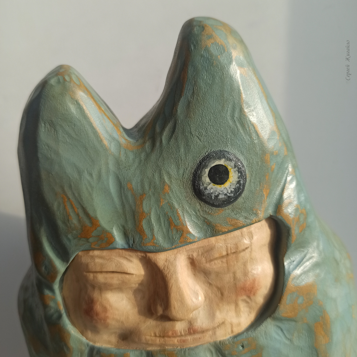Вот я и закончил "Рыбьего пастуха". Работа шла шибко. Только на последнем этапе завозился. Когда, вроде, всё завершено уже, осталось только склеить детали между собой и покрасить. Пока думал каким цветом, что да как ещё десять дней прошло. Но не жалею, так как и процессом, и результатом очень доволен. Покрыл скульптуру специальным защитным воском и сделал первые снимки. Сейчас буду вам показывать Как пришёл образ? Его, как обычно, просто пришлось выловить из кучи всякой всячины, плавающей внутри моих представлений о мире. Анна Ахматова, в своё время, уже сказала про это просто и весомо: "Когда б вы знали, Из какого сора Растут стихи..." Дальние неизведанные земли, охотники на заснеженной равнине, дикие скалы, сильные люди, суровая и простая жизнь, духи природы, живой камень, рыба-облако, плывущая в небе, северный эпос, сказка, чудо, тольтеки дона Хуана, анимэ Мураками... Чего только не намешано в голове художника и в его сердце. Образ вырисовывался необычный, было интересно, что же по