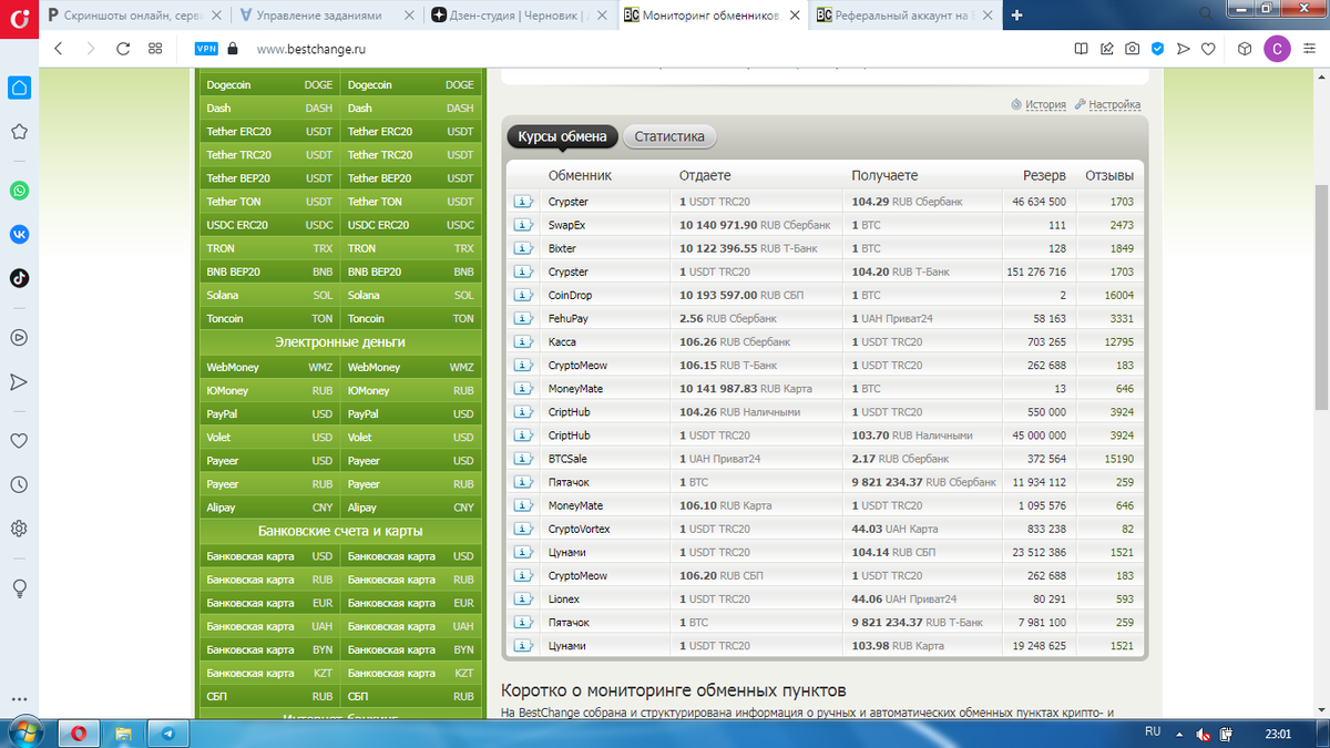 Мониторинг обменников разработан для тех, кто обменивает электронные деньги в Интернете, и для тех, кто хочет осуществлять гарантированные обмены с минимальными потерями на комиссиях обменных пунктов. Чтобы подробнее ознакомиться с сервисом BestChange, посмотрите обзорное видео. Ниже в таблице вы найдете информацию о самых лучших курсах обмена по 20-ти популярным направлениям. Выберите нужную вам валютную пару на панели слева (вкладки Таблица, Список, Популярное), чтобы получить полный список обменных пунктов по какому-то конкретному направлению.