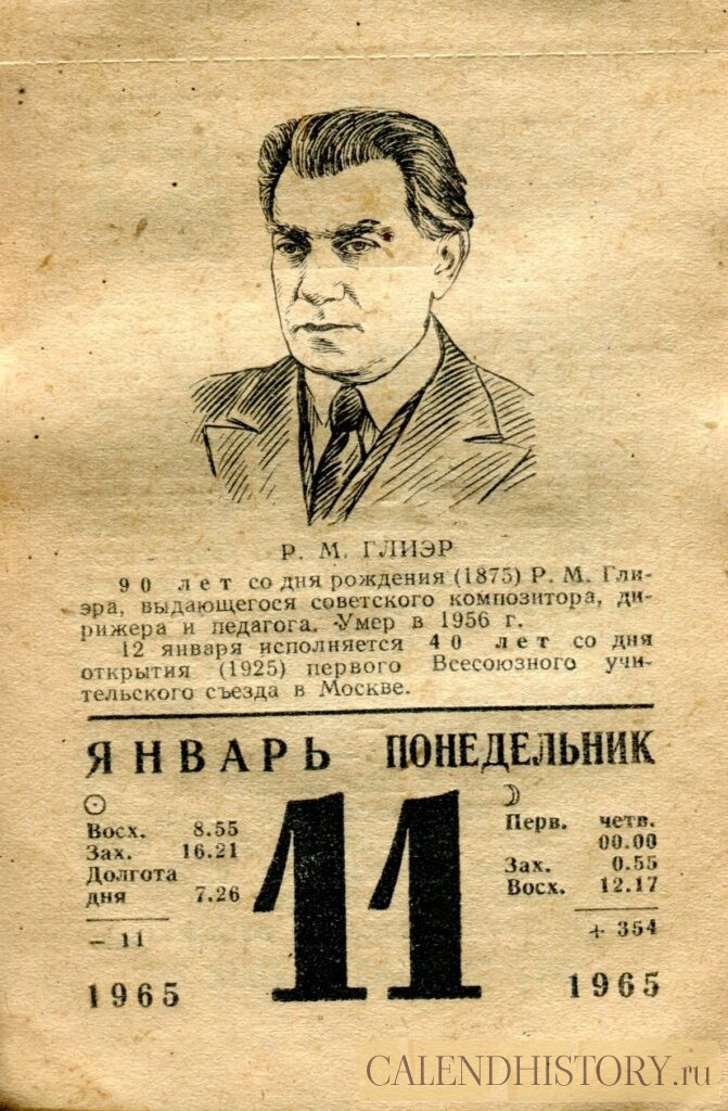 Итак, сегодня 11-го января и у нас на календаре 1965-й год. Перед нами листок советского календаря для женщин. На календаре у нас понедельник - 11 января 1965-го года. Р. М. ГЛИЭР 90 лет со дня рождения (1875) P. М. Глиэра, выдающегося советского композитора, дирижера и педагога. Умер в 1956 г. 12 января исполняется 40 лет со дня открытия (1925) первого Всесоюзного учительского съезда в Москве. *** Оборотную сторону листка этого календаря можно посмотреть у нас по ссылке на сайте. Другие листки советских календарей смотрите у нас на сайте - CALENDHISTORY.ru ПОСМОТРИТЕ ЕЩЁ ЛИСТКИ ОТРЫВНЫХ КАЛЕНДАРЕЙ: