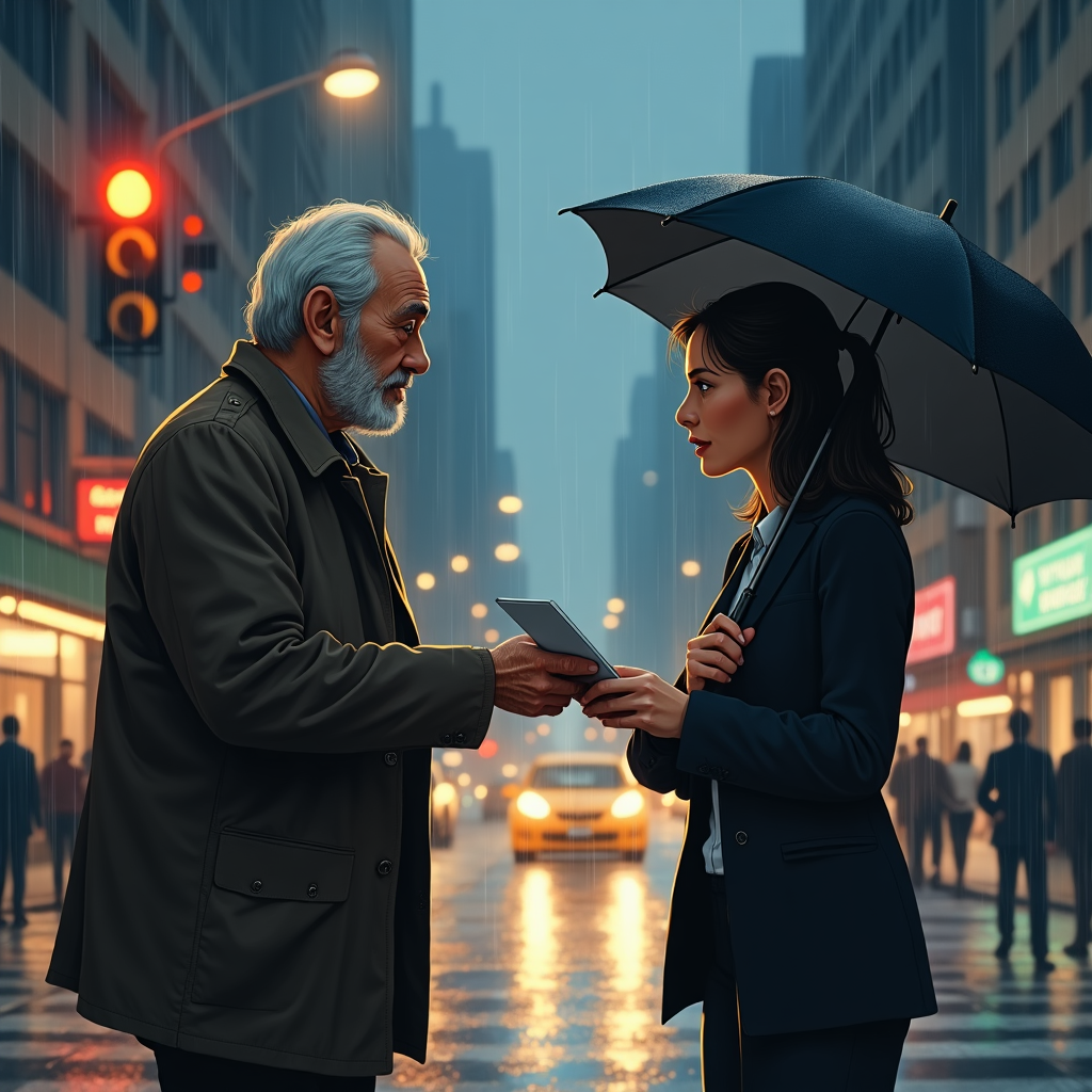 Анна спешила домой после долгого рабочего дня. Моросил мелкий дождь, и она мечтала поскорее оказаться в тепле. Внезапно её внимание привлёк пожилой мужчина, растерянно стоявший на краю тротуара. "Извините, вам нужна помощь?" - спросила Анна, подойдя ближе. Мужчина обернулся, и его глаза засветились благодарностью. "Ох, милая, я был бы очень признателен. Эти новые светофоры... Никак не могу понять, когда переходить." Анна улыбнулась и предложила свою руку. "Давайте я вас проведу." Когда они пересекали дорогу, мужчина представился: "Меня зовут Виктор Петрович. А вас?" "Анна," - ответила она, помогая ему подняться на тротуар. Виктор Петрович внимательно посмотрел на неё. "Анна, вы верите в судьбу?" Этот неожиданный вопрос застал её врасплох. "Не знаю... А почему вы спрашиваете?" Старик загадочно улыбнулся. "Потому что я ждал именно вас. У меня есть предложение, от которого вы не сможете отказаться." Анна удивлённо подняла брови. "Предложение? Какое?" "Вы когда-нибудь мечтали о настоящем