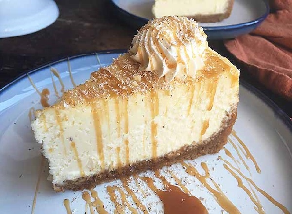 Взбейте сливки и украсьте верх чизкейка с помощью кондитерского шприца. При подаче полейте карамельным соусом и посыпьте свежетертым мускатным орехом.