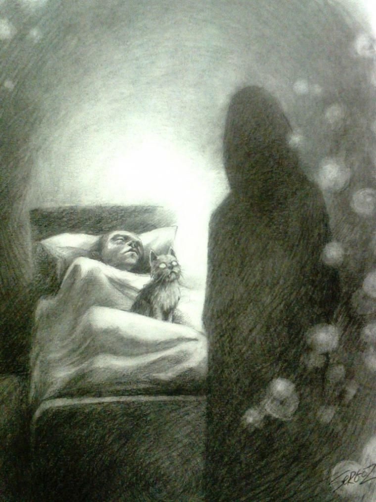 Хозяйка пришла и встала напротив меня где то метр а то и полтора, тень была размыта, тоже в черном плаще и капюшоне, попросила помощи в снятии бесов и чтоб забрала их в лоно своё, Она согласилась.