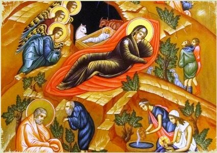 Дева днесь Пресущественнаго раждает,/ и земля вертеп Неприступному приносит,/ Ангели с пастырьми славословят,/ волсви же со звездою путешествуют:/ нас бо ради родися// Отроча Младо, Превечный Бог.