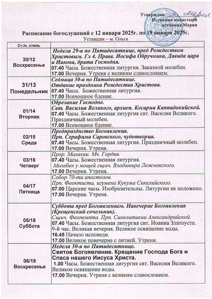 12-19.01. Расписание богослужений в Введенском женском монастыре