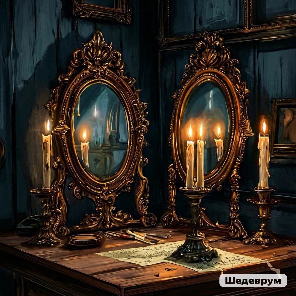 На круглом столе в предбаннике мы поставили два зеркала. Зажжённые свечи позволяли рассмотреть длинный коридор зазеркалья.