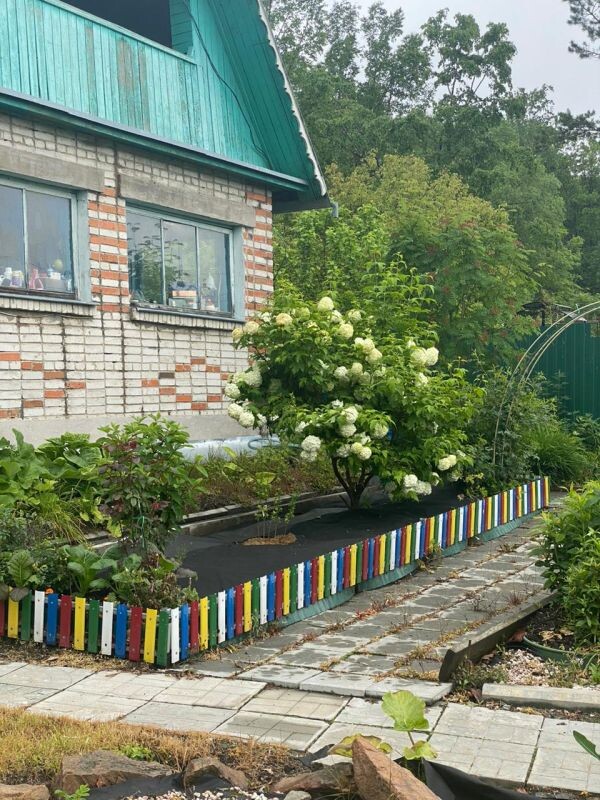 — Проходы между рядами застилаю лутрасилом, что минимизирует необходимость прополки и позволяет ходить по дорожкам босиком. У нас везде дорожки из бетонных плиток. Наша главная задача заключалась в том, чтобы безопасно передвигаться по участку, не спотыкаться о грядки. Даже в дождливую погоду я могу ходить по участку в туфельках, — поясняет Татьяна. С ее слов, на участке есть три уютных уголка: в саду, в малиннике и среди цветов, и везде стоят лавочки для отдыха.