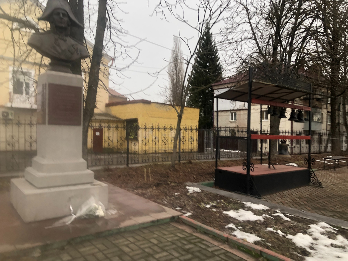Это были новогодние праздники. В один из дней мы находились и насмотрелись и искали работающее кафе (большинство были закрыты). Кафе, пусть и не сразу, но нашли, но на входе я зависла, посмотрев в соседний двор: "А это кто там в треуголке?". Оказалось, что это двор часовни в честь всех Святых воинов на улице Калинина, где возле колоколов установлен бюст Фёдора Ушакова. И обратите внимание на надпись. Как выяснилось, памятник был открыт в 2017 году во время празднований Дней Москвы (вот такое есть в Брянске, надо же :)). Новую достопримечательность городу подарил «Культурно-патриотический центр «Армия и культура» из Краснодарского края в рамках участия ДОСААФ России в проекте «Аллея русской славы». Средства на изготовление скульптуры и её установку внесли региональное отделение ДОСААФ и организация ветеранов флота «Брянское морское собрание». Да, как ни странно, у сухопутного Брянска есть морская история. Брянской флотилией назывался первый российский флот на Черном море, созданный в 1