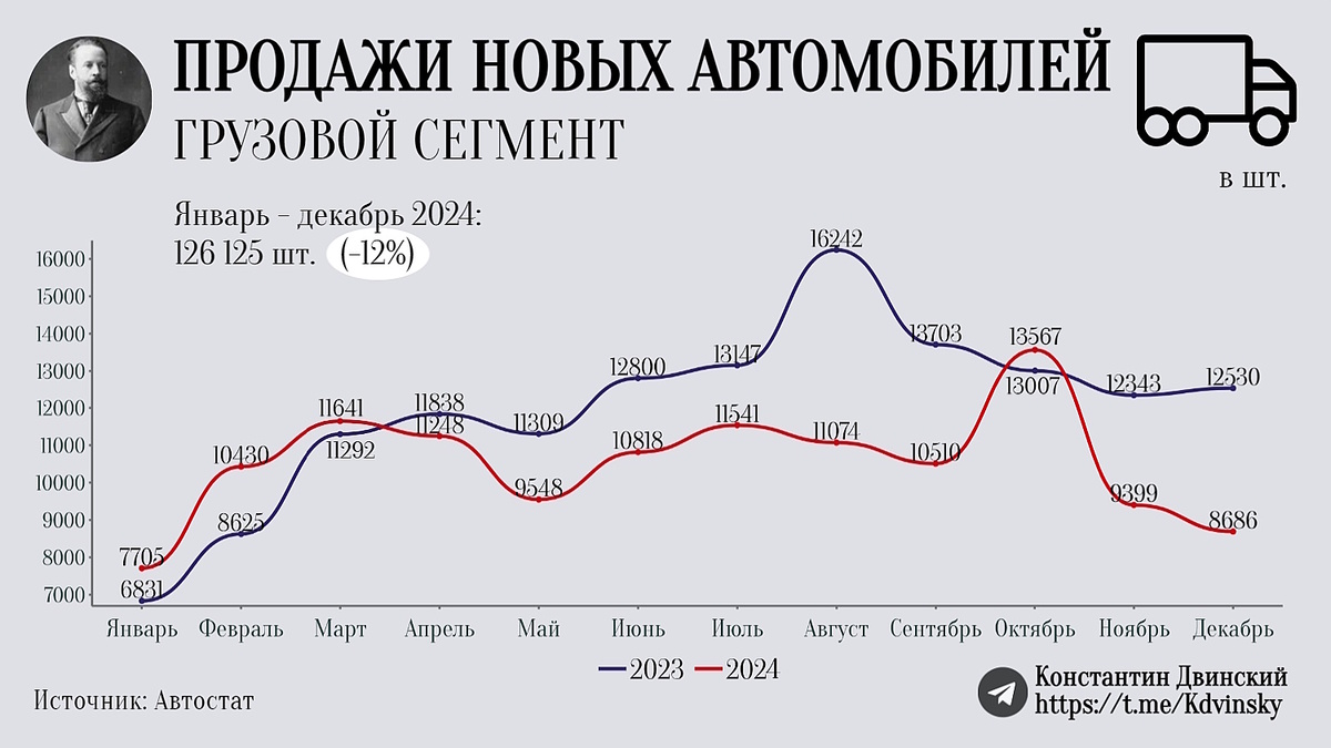 В 2024 году рынок новых грузовых автомобилей составил 126,1 тысяч единиц, что на 12% меньше, чем годом ранее (143,6 тыс.). Рынок грузовых и легких коммерческих автомобилей является опережающим индикатором общего положения дел в экономике. Покупка компаниями коммерческого транспорта означает, что они планируют расширять свою деятельность и/или имеют средства на обновление техники. Цифра в 126 тысяч – неплохой показатель, который означает, что 2024 год наша экономика, действительно, прошла уверенно. Для сравнения – во время силуаново-набиуллинской стагнации 2015-2019 гг. рынок новых грузовых автомобилей составлял 80-100 тыс. единиц. Тем не менее, продажи сократились на 12% по сравнению с 2023 годом. Тогда рынок грузовиков отчетливо отразил перспективы высоких темпов роста ВВП в 2024 году. Однако сейчас важно не столько сокращение общего показателя, сколько сильное падение продаж в ноябре (-24% г/г) и декабре (-30% г/г), что отчетливо видно на графике. Плохая тенденция, которая продолжитс
