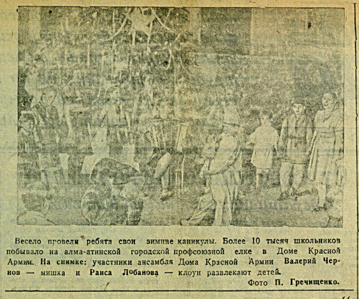 «Весело провели ребята свои новогодние каникулы. Более 10 тысяч школьников побывало на алма-атинской городской профсоюзной ёлке в Доме Красной Армии. На снимке: участники ансамбля Дома Красной Армии Валерий Чернов – мишка и Раиса Лобанова – клоун развлекают детей».