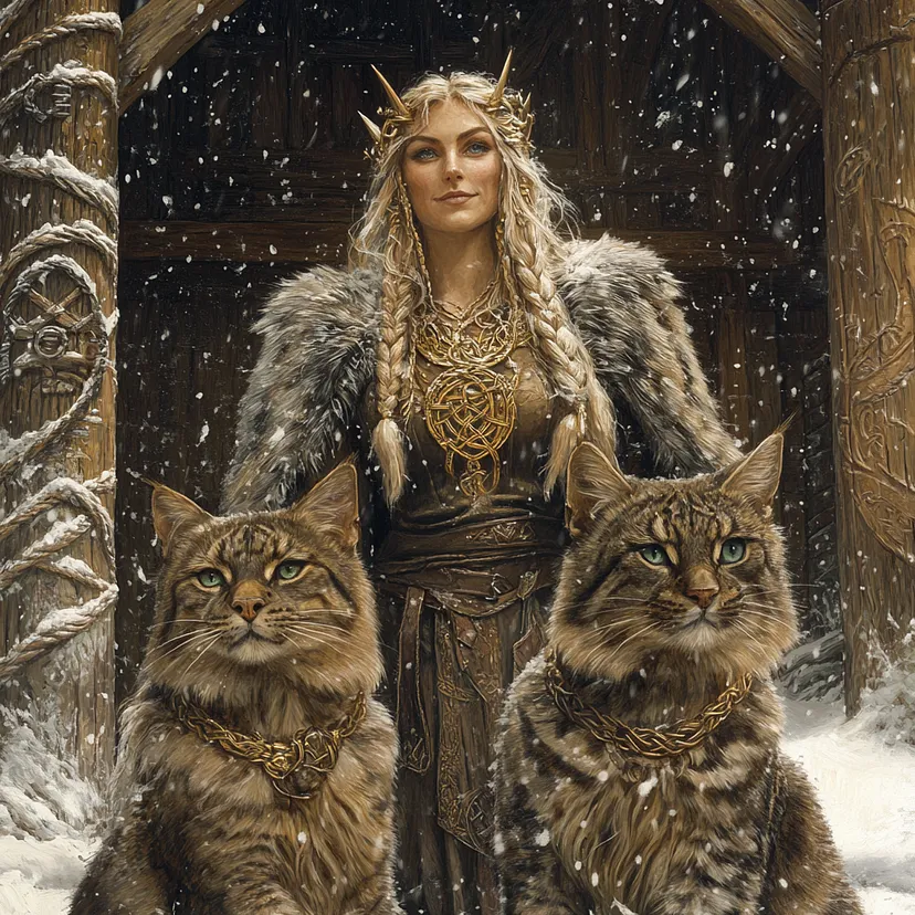 Образ Фрейи – повозка, запряжённая кошками, и связь с соколами – отражает её близость к миру природы и способность свободно перемещаться между разными сферами бытия.