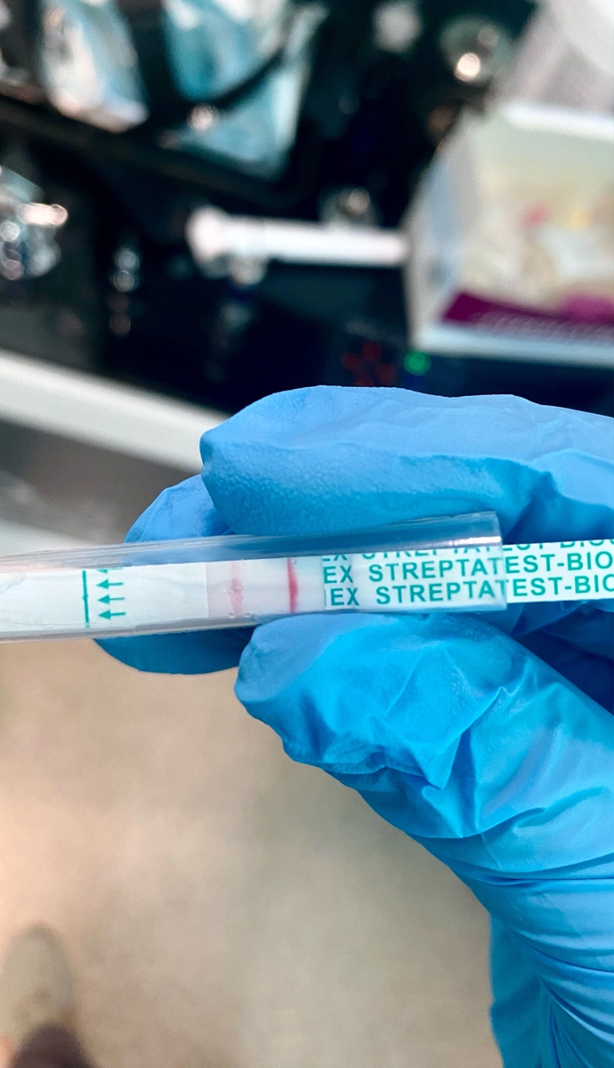 Стрептатест – это высокоточный экспресс-анализ, разработанный с целью диагностики инфекции, вызванной бактерией стрептококк.Один из главных преимуществ стрептатеста – его высокая точность и скорость получения результатов (не нужно ждать 7 рабочих дней 👍,а всего лишь пару минут во время приема 🙌)
