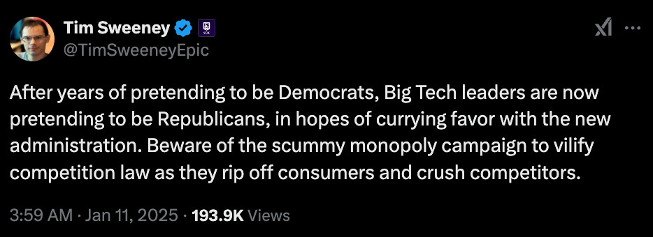 Глава Epic заявил, что технологические лидеры притворяются республиканцами для сближения с Трампом ради обхода антимонопольных законов