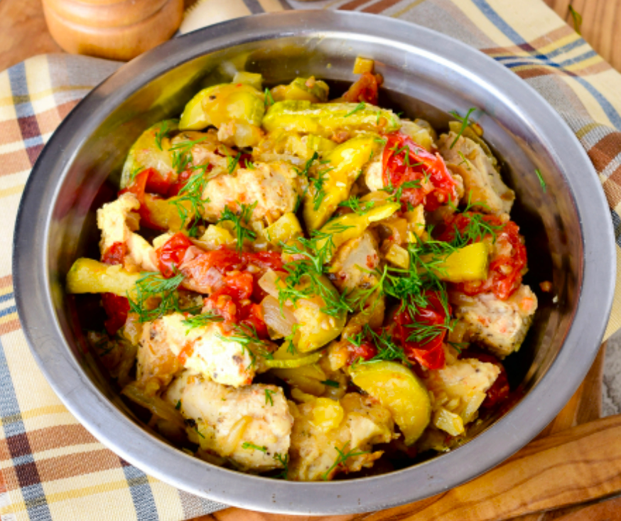 Перед подачей индейку с кабачком и помидорами , посыпать зеленью укропа. Приятного аппетита!