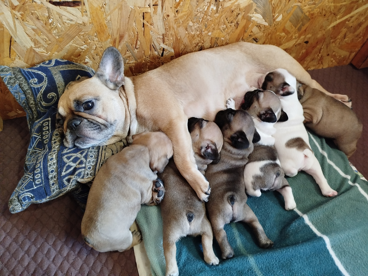 Мордатая такая дева. В складочку, шкурастая. Добротная, большая. Мне нравится, когда большие и толстые, чтобы не говорили бульдожисты. Хорошо кушает, как понятно из веса. Сама ест и подходит сама уже на зов.
