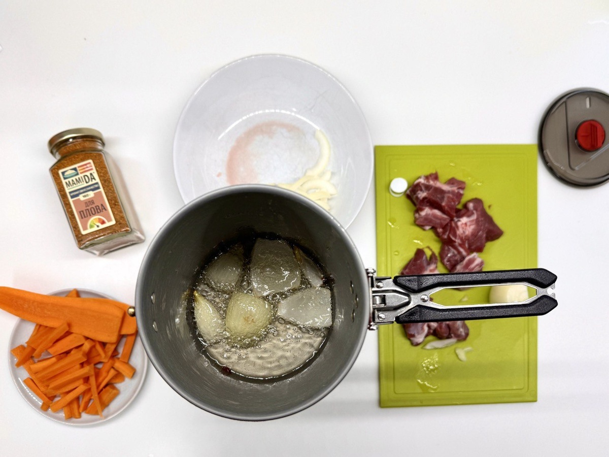 В процессе готовки налил в котелок немного подсолнечного масла, около 1 см по дну. Разжег горелку, и масло быстро стало разогреваться. Затем добавил четверть луковицы и начал обжаривать, постоянно помешивая его в котелке ложкой. В этом моменте важно и не трудно научиться регулировать силу горелки. Котелок имеет тонкое дно, что позволяет ему мгновенно нагреваться; главное – не пропустить этот момент. Когда лук обжарился, я вытащил его и выкинул. Я всегда поступаю так с первым луком, так меня учили готовить плов.