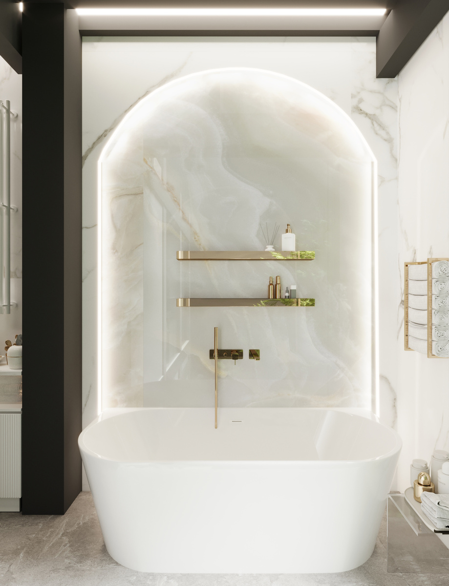 При выборе стиля для санузла мы придерживались правила «единообразия». Если интерьер всего дома минималистичный, то даже детский санузел грамотнее выдерживать в общем стиле. Отказались от откровенно детских элементов. Ведь подростки вовсю стремятся походить на взрослых. Постарались разработать стильный, современный дизайн в соответствии с личными представлениями маленьких заказчиков об уюте и комфорте. За основу девичьего интерьера взяли керамогранит компании Италон, коллекция Шарм Делюкс. "Белый мрамор» с нежными, едва заметными прожилками в сочетании с плиткой «под бетон» приобретает очень интересное звучание. То, что нужно для подростков. Полы сделали из светло-серой плитки с фактурой камня. Наш монохромный интерьер все же не обошелся без цвета. Акцентами служат латунная рамка стеклянной душевой кабины и сантехнические «золотые» аксессуары Boheme. Чтобы сократить девочкам утреннее время водных процедур, поставили два умывальника с забавными трубчатыми раковинами. Также очень удобно