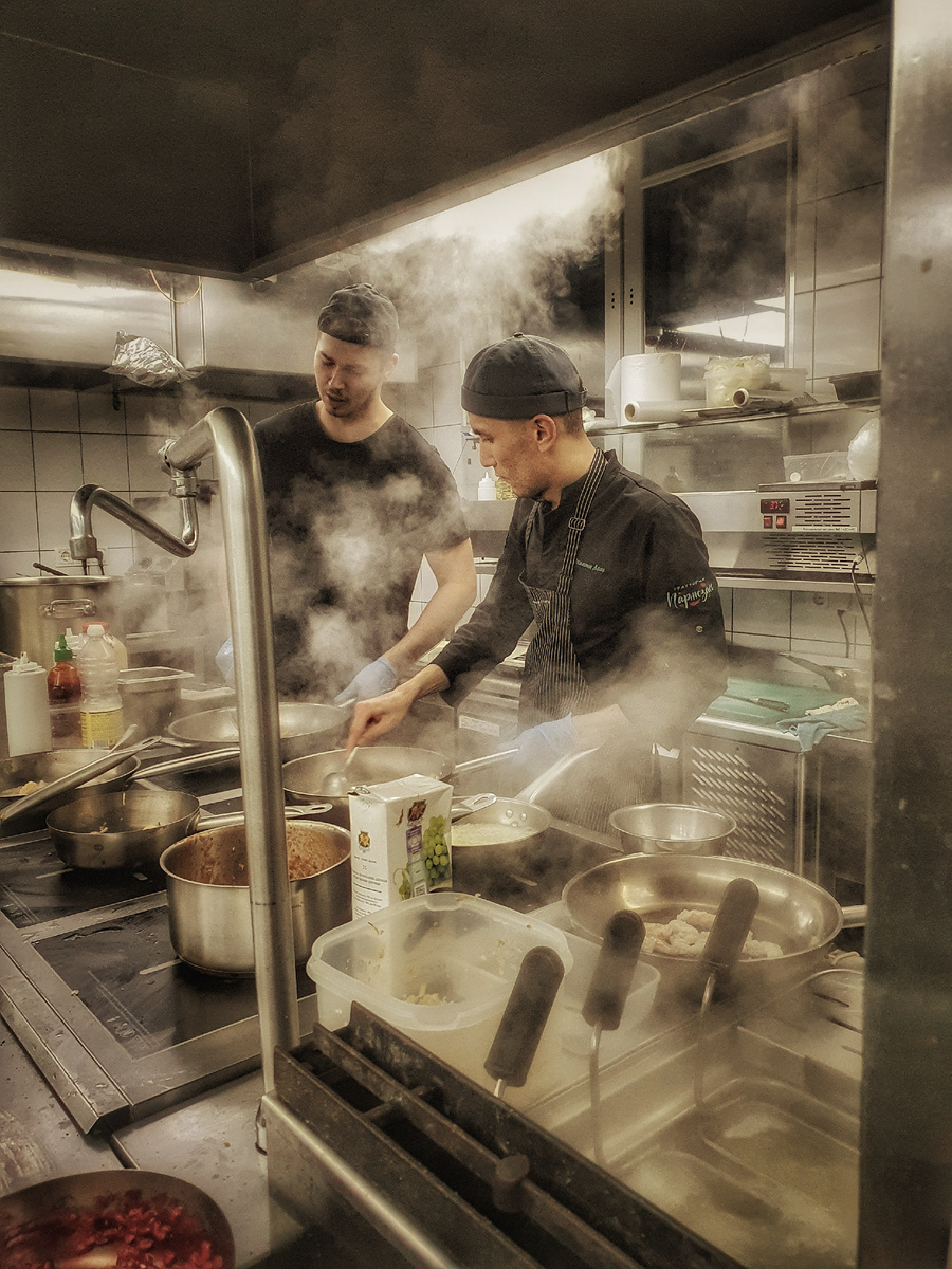 Встаю с ним рядом, начинаем готовить, показываю, объясняю просто: «Сделай, как я показал». Да, кивает он, вроде потихоньку начинает работать, встал за соседний стол, переключился на заготовки. Слушаю мерное гудение кухни, вопрос — ответ, ответ — вопрос, понимаю, что к его позиции вопросов больше и больше. В ответ готовлю, ставлю через пять минут, и так по кругу. На плиту смотрю, на ней нет ничего, подхожу молча, начинаю накидывать, по-быстрому раскидываю, говорю: «Понял?» Он кивает: «Да», но в глазах пустота и на губах глупая улыбка. Думаю: «Бл..ь, ну почему?» Улыбаюсь в ответ и снова отхожу, уступая место бывалому. После третьего круга начинает фляга свистеть у раздатчика, подходит, шепчет: «Я его сейчас придушу». Успокаиваю, глажу по голове, говорю: давай, парень первый день, на опыте, тем более я рядом помогаю, не ссы, прорвемся. Начинается вечерняя посадка, сыпятся заказы, к нему копятся вопросы, парень на опыте начинает нервничать, мы говорим: «Друг, ты что, первый раз?» В ответ гениальная фраза: «Хули вы меня дрочите, я уже 17 лет в общепите». И тут захотелось поставить все на паузу. Подхожу, объясняю: ты не слышишь, что все отвечают на вопросы раздачи, и я, стоя рядом с тобой, точно также отвечаю, коротко, сколько бы раз ни спросили, и проговариваю, для чего это нужно бедному раздатчику, да будут его нервы крепкие, как канаты. Вечерний сервис подходит к концу, до конца осталось пару часов, говорю: дружище, всё норм? Да, шеф, всё хорошо. Ну что, говорю, остался последний рывок, нужно сварить суп на персонал на 10 литров, бульон вот, пассеровка вот, овощи в камере, паста в морозильнике, сделай вкусно, нужен завтра с утра. В ответ: «Ок, босс, все будет сделано», — и начинает запекать овощи, судя по продуктам, завтра будет шурпа как минимум. Делаю контрольный круг по кухне. Говорю всем до свидания и ухожу в завтрашний день.