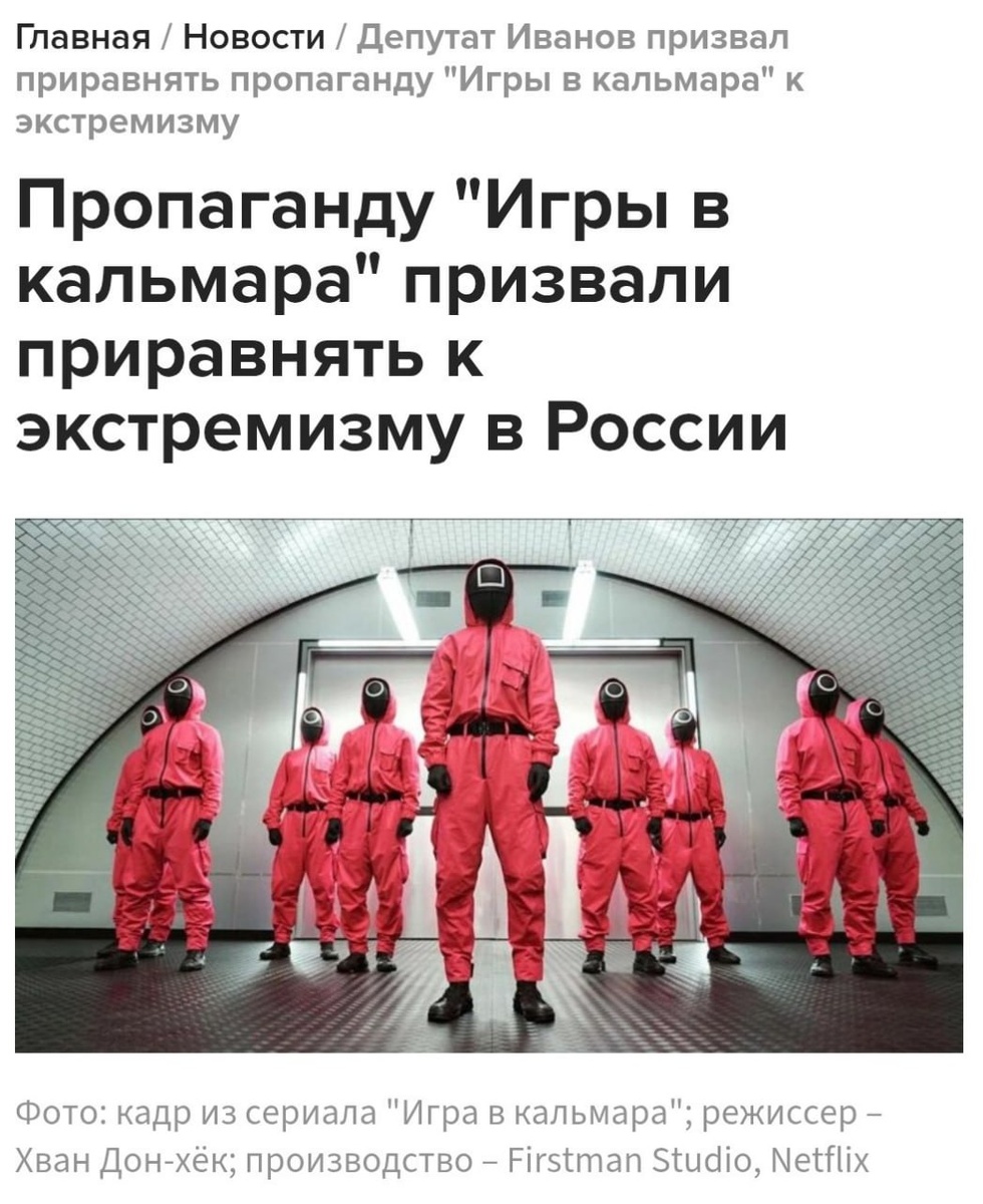 «Игру в кальмара» ЗАПРЕТЯТ в России — в Госдуме предложили признать шоу экстремистским из-за «распространения неверных моральных ориентиров». По словам депутата Михаила Иванова, шоу содержит в себе неприкрытую пропаганду убийств, насилия и жестокости, что подпадает под статью УК РФ.