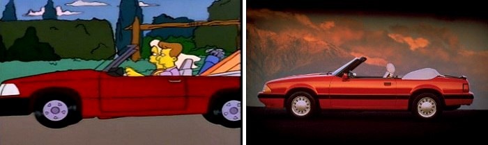 Вероятно, именно этот автомобиль можно назвать рекордсменом по числу появлений в «Симпсонах». «Мустанги» мелькают на экране снова и снова – их в сериале можно насчитать не меньше полудюжины. В кадре появлялись как культовые модели 1964 года выпуска, так и более поздние версии конца 80-х – начала 90-х годов. Например, один из «Мустангов» принадлежал сыну мэра Спрингфилда, а другой стал транспортом для молодоженов, которые отправились на нём в своё первое свадебное приключение.
