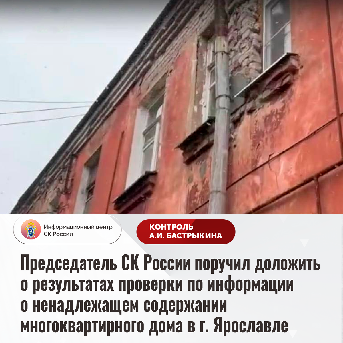 Председатель СК России поручил доложить о результатах проверки по информации о ненадлежащем содержании многоквартирного дома в г. Ярославле