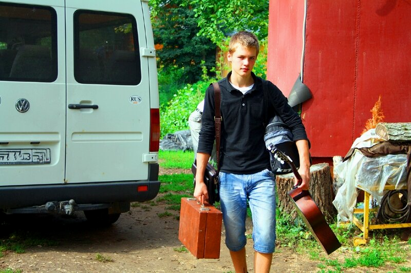 1. Я успел приехать в числе первых, так что смог запечатлеть, как народ выгружает свои вещи и несет их к домику. 2. Этот парень прибыл почти что налегке. Или, может быть, сходил за вещами по второму разу. 3. Среди вещей были и микрофонодержатели – очень нужная в хозяйстве вещь. 4. А коврик – вообще архинужный предмет. Ведь условия здесь полуспартанские. 5. Ну и, конечно же, какая база отдыха без тромбона! 6. Начинают происходить сцены встреч с друзьями, с горячими объятиями 7. Звукооператор приехал без тромбона, но с пультом. И сразу же присту