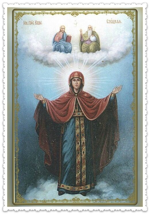 24 января - день празднования Елецкой иконы Богородицы. Эта икона была явлена в 1060 году на горе Болдиной недалеко от Чернигова, на ели. Икона сразу же прославилась многими чудотворениями. Список с иконы, который тоже является чудотворным, находится в Смоленском храме города Ельца Орловской области. О Дево Пресвятая Богородице, земли Русския и мира всего хранительнице и заступнице, просим Тя, чадолюбивая Мати, даруй нам покаяние во гресех и настави разум наш к познанию истины во спасение, град наш и вся грады и веси христианския защити и сохрани, спаси всех имиже веси судьбами и тамо умоли, державная Царице, землю Русскую покаянием возродити и к Царству Небесному путеводствуй нас, грешных и убогих, да тамо воспоем Богу в Троице Святей славимому, Отцу и Сыну и Святому Духу песнь хваления, ныне и присно и во веки веков. Аминь.