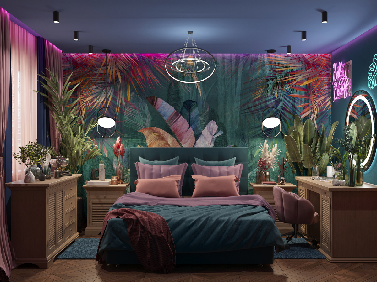 Очень смелое и яркое решение интерьера в тропическом стиле.