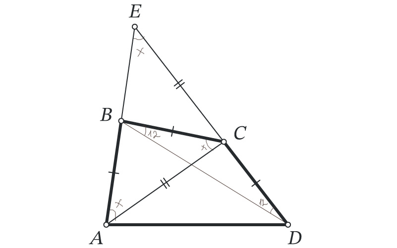 В четырёхугольнике ABCD стороны AB, BC, CD равны. Лучи AB и DC пересекаются в точке E. Оказалось, что AC=CE. Найдите ∠AED, если ∠CBD=12∘. Обозначим угол AED за х. И сразу заметим тот факт, что треугольник АЕС равнобедренный, а значит угол ЕАС тоже х. И тут же видим, что треугольник АВС тоже равнобедренный, и угол ВСА тоже получается х. Отлично. Угол CBD нам дан, и сразу же опять очевидно, что треугольник CBD тоже равнобедренный, а значит угол С в нем равен 180-12-12=156, ну и смежный ему угол ВСЕ равен 24 градуса. И настало время посмотреть на треугольник АСЕ. Углы в нем равны х, х и х+24. Ловко используем тот факт, что сумма углов в треугольнике равна 180, и получаем: 3х+24=180 х=52 Ответ: 52 Другие задачи раздела