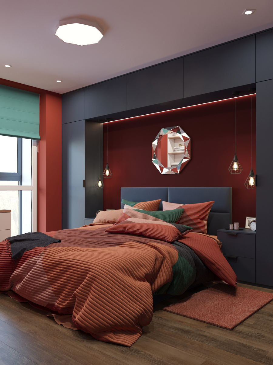 Что самое главное в спальни - конечно, кровать. С неё то всё и началось. Выбрали подходящую и как раз по цвету синюю (цвет, который уже присутствует в интерьере квартиры, но в разных оттенках и пропорциях). Повторила сложный синий цвет в шкафах. Стена за изголовьем кровати бордового цвета (я его уже использовала в интерьере кухни-гостиной), что придаёт пространству глубины. Этот цвет я повторила в пуфике, где находится туалетный столик. Все остальные стены выкрашены в терракотовый цвет. Он отлично сочетается со всеми остальными уже ранее выбранными цветами. Стена, которая находится напротив кровати, чтобы не казалась пустой и добавить ей фактуру, я предложила сделать интересную композицию из разного багета и выкрасить их в тот же цвет что и сама стена. В эту композицию можно добавлять свои фотографии, за счёт этого она может меняться и быть ещё более необычной, наполненной и живой. Также я не забываю про уже заданную геометрию в других комнатах и использую ее в светильниках, зеркале, п
