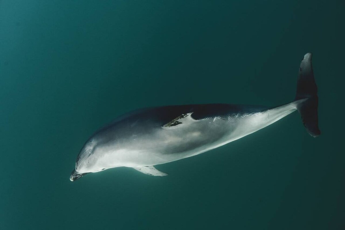 Все встреченные дельфины выглядели очень бодрыми, упитанными. Но на одной афалине были замечены черные пятна — на спинном и грудном плавниках, голове и роструме. Это первый дельфин с пятнами мазута, которого эксперты встретили за время проведения мониторингов в море.
